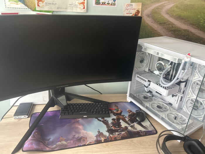 The scene depicts a personal computer workstation on a light-colored wooden desk in Svishtov, Bulgaria. A large, black, curved AOC Phantom Gaming monitor with its stand is centered on the desk. Under the monitor's stand is a compact, black mechanical keyboard. To the left of the monitor stand rests a black solar power bank with USB ports. A large rectangular mousepad featuring colorful video game characters and a stylized town occupies the central desk area. On the mousepad, to the right of the keyboard, is a dark-colored gaming mouse. To the right of the monitor, a white computer tower with a transparent side panel displays its internal components, including multiple white fans, a liquid cooling system, and a visible NVIDIA GeForce RTX graphics card. A small Santa Claus figurine is clipped to the top front edge of the PC tower. A pair of black over-ear headphones lies on the desk to the right of the computer tower. The background features a light blue wall on the left and a wall covering depicting a dirt road winding through a green field on the right. Several papers and posters are affixed to the wall above the desk, including one with "OZIS Just Love" and a portrait, and others appearing to be academic certificates.