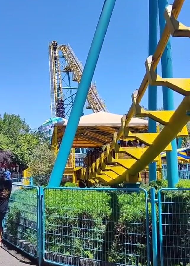 roller coaster at an amusement park. The roller coaster is painted yellow and teal. The train cars of the roller coaster, which appear to be black, are full of people as it moves along the track. The tracks are above a covered loading zone. Green foliage grows in a fenced area in the foreground. A person wearing a black shirt and jeans stands beside the fence near a yellow dot on the walkway. The sky is clear and blue.