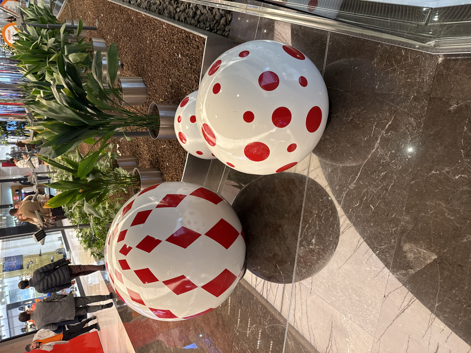 A tilted overhead shot showcases three large, decorative spheres. One features a checkered red-and-white pattern, while the other two are white with red polka dots in varying sizes. The spheres cast shadows on the marble floor. To the left, a row of silver planters holds green plants. The scene is set indoors, possibly a shopping mall, with people visible in the blurred background. The spheres are arranged in a line, adding an artistic element to the interior design.
