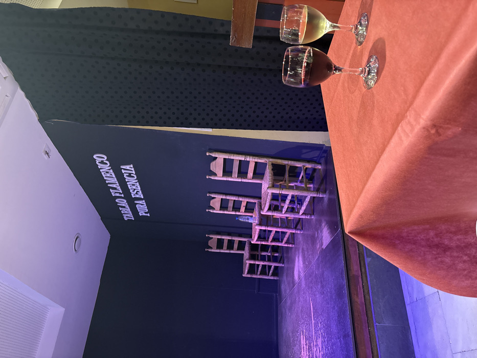 The scene features a backdrop with "TABLAO FLAMENCO PURA ESENCIA" in white lettering. Four wooden chairs of varying sizes are stacked on the floor. A water bottle rests between the two larger chairs. A red tablecloth covers a surface in the foreground, holding two wine glasses filled with red and white wine. A curtain with dark polka dots hangs overhead. The room is illuminated with purple and blue lighting.