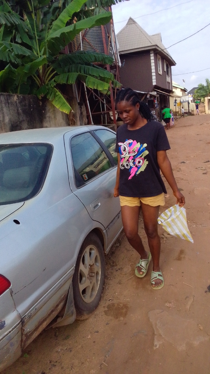 The image depicts a street scene in Onitsha, Nigeria, featuring a young adult Black female walking on an unpaved, reddish-brown dirt road. She wears a black t-shirt with a multi-colored abstract design, light yellow shorts, and light green open-toed sandals. In her left hand, she carries a white and yellow-striped plastic bag, and her gaze is directed downwards. To her immediate left, a silver sedan, identified as a Toyota Camry model from the mid-1990s, is parked or abandoned. The vehicle displays visible wear, including a dent on the rear passenger door, corrosion and damage along the lower rocker panel, and a partially detached mud flap. The rear bumper also shows a missing cap or hole. In the background, behind the vehicle, is a concrete wall, dense foliage of banana plants, and a corrugated metal water tank elevated on a metal frame structure. Further right in the background, a two-story building with a brown facade, white trim, and a prominent peaked, multi-gabled roof with gray tiles is visible. Below this building, structures consistent with small shops or market stalls are present. The dirt road extends into the distance, where other indistinct figures of individuals are observed, including one person in green attire and another carrying an item on their head. The scene is illuminated by natural daylight, indicating daytime conditions.