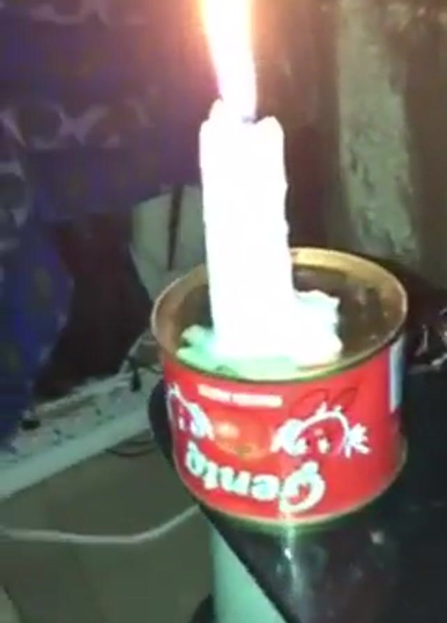 A white candle burns in a tin can