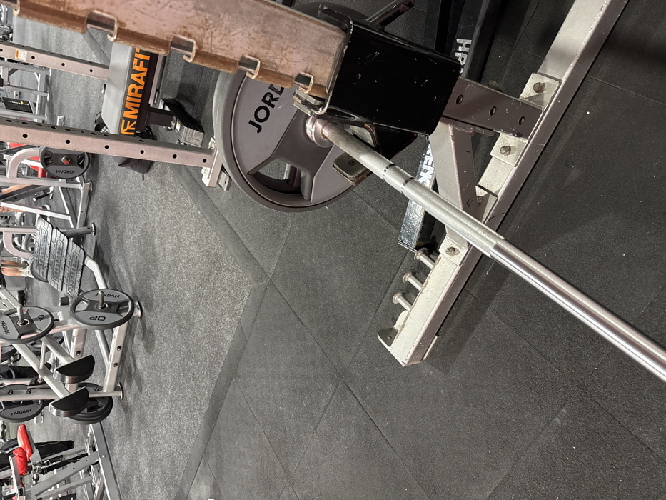 This image depicts an indoor gym facility located in Mid Suffolk, United Kingdom. The foreground features a silver Olympic barbell resting horizontally on the adjustable safety catches of a metal squat rack or power cage. One end of the barbell is loaded with a grey "JORDAN" branded weight plate, marked "20," indicating a 20kg mass. The squat rack itself is constructed from silver-colored metal with black components and is visibly bolted to the dark grey rubber tiled floor. Adjacent to the squat rack, a dark "MIRAFIT" branded weight bench with orange lettering is positioned. In the midground, an angled leg press machine is visible, also equipped with "JORDAN" branded 20kg weight plates. The floor transitions from larger, solid dark grey rubber tiles in the immediate foreground to smaller, speckled dark grey rubber tiles further back. Blurred figures, representing the lower limbs of individuals, are discernible in the distant background, indicating other occupants within the gym. No direct actions or interactions are taking place within the focused areas of the scene.