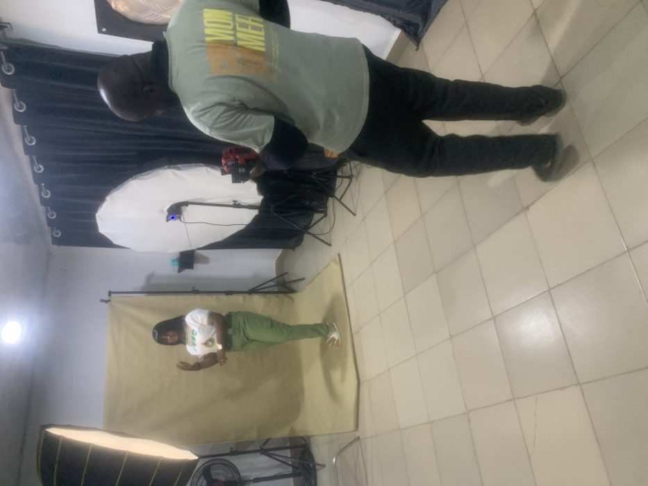 A man takes a photo of a woman in a studio setting. He stands, holding a camera near a large softbox. The woman poses against a neutral backdrop, wearing a white shirt and green pants. Additional lighting equipment, including a reflector and another softbox, frame the scene. A fan sits on the floor, while a black curtain is draped in the background. The floor is tiled with light-colored squares.