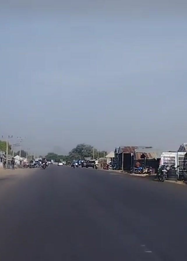 view from a moving vehicle traveling along a paved road that bisects a rural town or village. The sky is overcast, providing a muted, diffused light. The road surface is generally well-maintained, with visible lane markings or dividers. On either side of the road, there are various structures ranging from commercial buildings and shops to residences. These buildings appear to be of modest construction, some with corrugated metal roofs. Several individuals are visible: some are standing by the roadside, others are walking, and several are riding motorbikes. Vehicles, including cars and motorcycles, are present, both parked and in motion. A prominent feature of the environment is the presence of utility poles with power lines running along the side of the road. The surroundings consist of a mix of natural and man-made elements, giving the impression of a semi-urbanized, developing area.