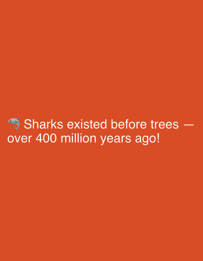 The image displays white text on a solid, vibrant orange background. A blue-grey shark emoji precedes the text, which states: "Sharks existed before trees — over 400 million years ago!" The text is centrally aligned horizontally and positioned in the lower third of the frame. No other objects, individuals, or environmental features are present within the graphic itself. The scene is located in Edirne Merkez, Turkey.