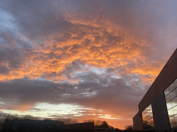 A vibrant sunset paints the sky with fiery orange hues, illuminating scattered clouds. Gray clouds blend with patches of blue. A large, modern building with reflective windows stands on the right. Below, silhouettes of trees and other buildings can be seen. The warm colors create a beautiful contrast with the darker elements.