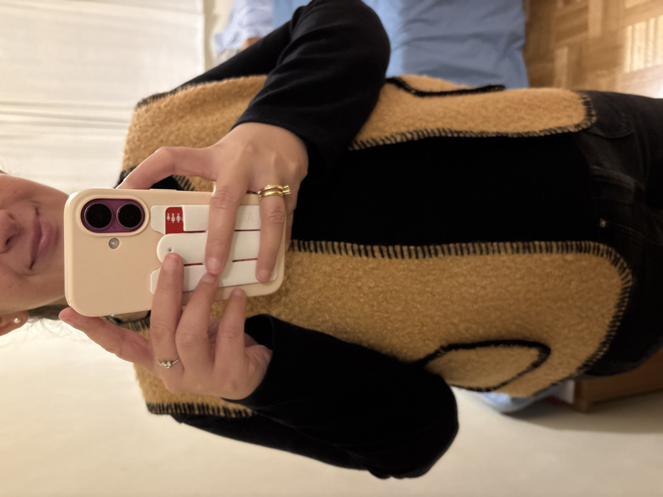 An individual is captured in a mirror selfie within an indoor residential setting. The subject, a person from the chin to the upper thigh, is smiling faintly, displaying light skin, a small white stud earring on the visible right earlobe, and dark hair pulled back. They wear a black long-sleeved top underneath a tan or camel-colored sherpa-textured vest with black contrast stitching and trim, and dark-colored trousers are partially visible at the waist. The subject holds a light beige-cased smartphone in both hands, positioned for the selfie. The phone's rear camera module shows two purple-tinted lenses and a flash. A white accessory, possibly a card holder or grip, is attached to the phone case, featuring three vertical white strips with red detailing on the rightmost strip. A silver-toned ring is on the right hand's ring finger, and two gold-toned rings are stacked on the left hand's ring finger. The background consists of a light-colored wall, a segment of a bed with a blue duvet on the right, and a parquet or herringbone pattern wooden floor partially visible at the bottom right. The indoor setting offers no specific geographical identifiers to confirm the location as Madrid, Spain.