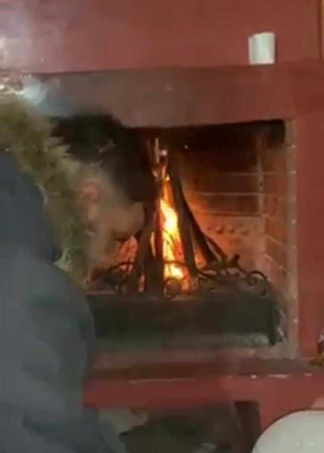 A man wearing a dark hooded coat with fur trim is sitting in front of a brick fireplace. The fireplace contains a small fire with several burning logs arranged in a tent-like formation. The fire is emitting light and flickering flames. The fireplace has a dark metal grate in front of the fire. The wall surrounding the fireplace is painted red. A roll of paper towels is visible on the top of the fireplace surround. A water bottle is sitting on the floor to the right. The man appears to be attending to the fire. Another person is sitting in the lower right corner of the frame, wearing a light-colored jacket.