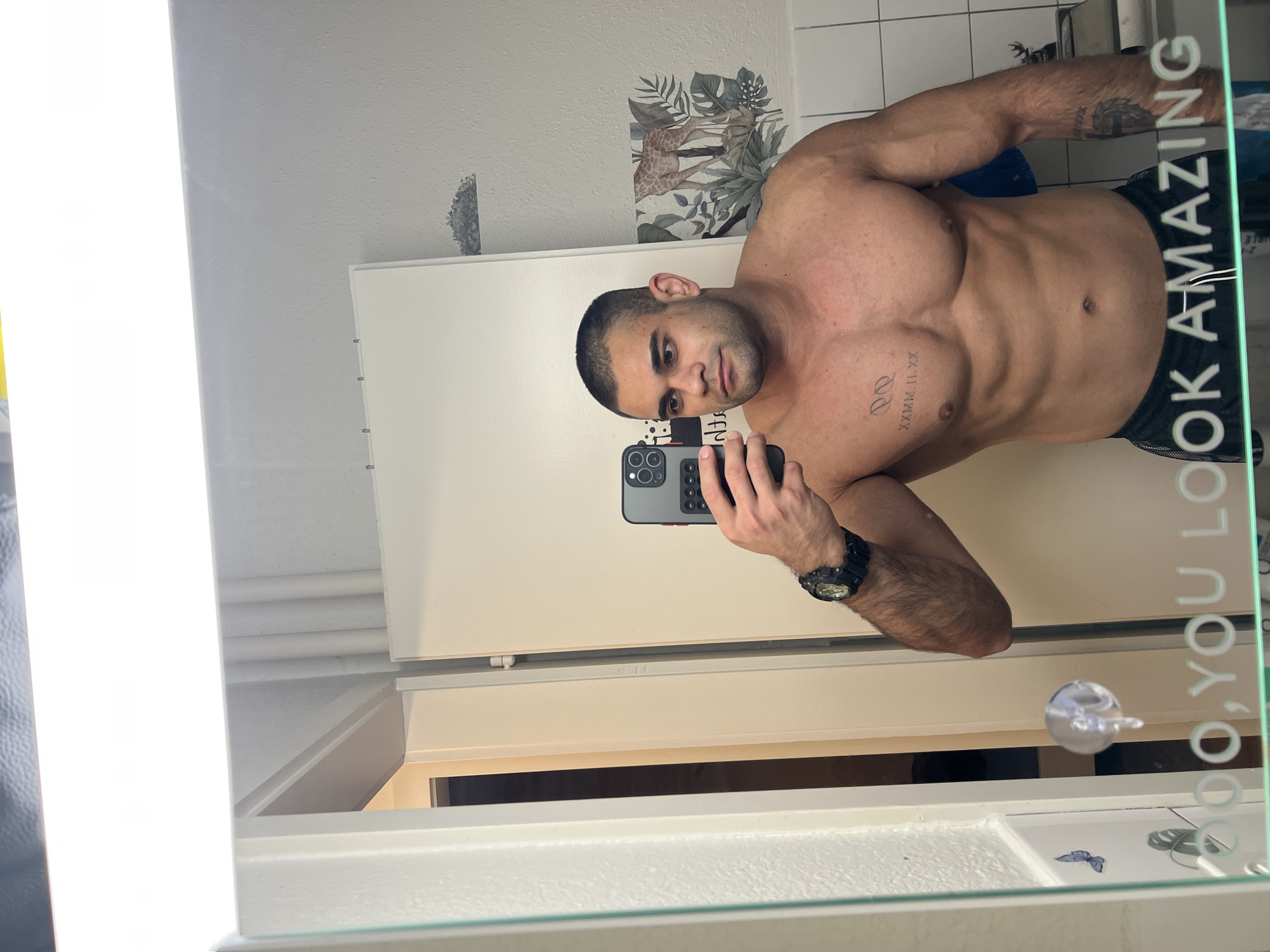 A muscular man with a shaved head is taking a selfie in a bathroom mirror. He is shirtless, wearing dark athletic shorts with white stripes at the sides. He has a watch on his left wrist and tattoos on his chest and left arm. The bathroom has a white door or cabinet, a white sink, and patterned wallpaper with images of giraffes and foliage. The mirror has an inscription reading, "YOU LOOK AMAZING." The exact location in Basel, Switzerland cannot be determined from the image.