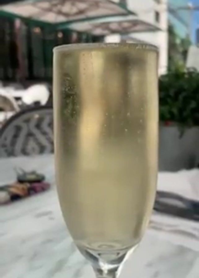 champagne flute filled with a light-colored, fizzy liquid. The drink has bubbles rising through it and a foamy top. The flute is set on a marble-patterned table. In the background, there is an outdoor seating area of a restaurant or café, with tables, chairs, and some greenery in pots. A building with large windows is visible beyond the seating area. The lighting suggests it is daytime.