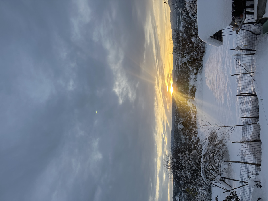 A winter landscape during sunset. The sky is a mix of gray clouds with the sun breaking through, casting golden rays across the scene. Snow covers the ground, trees, and a wire fence. A building or structure is visible in the distance, also covered in snow. The overall impression is one of serene coldness, contrasted by the warmth of the setting sun.