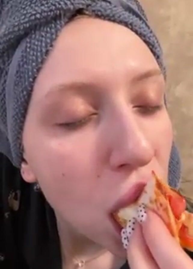 A close-up video shows a woman eating a slice of pizza