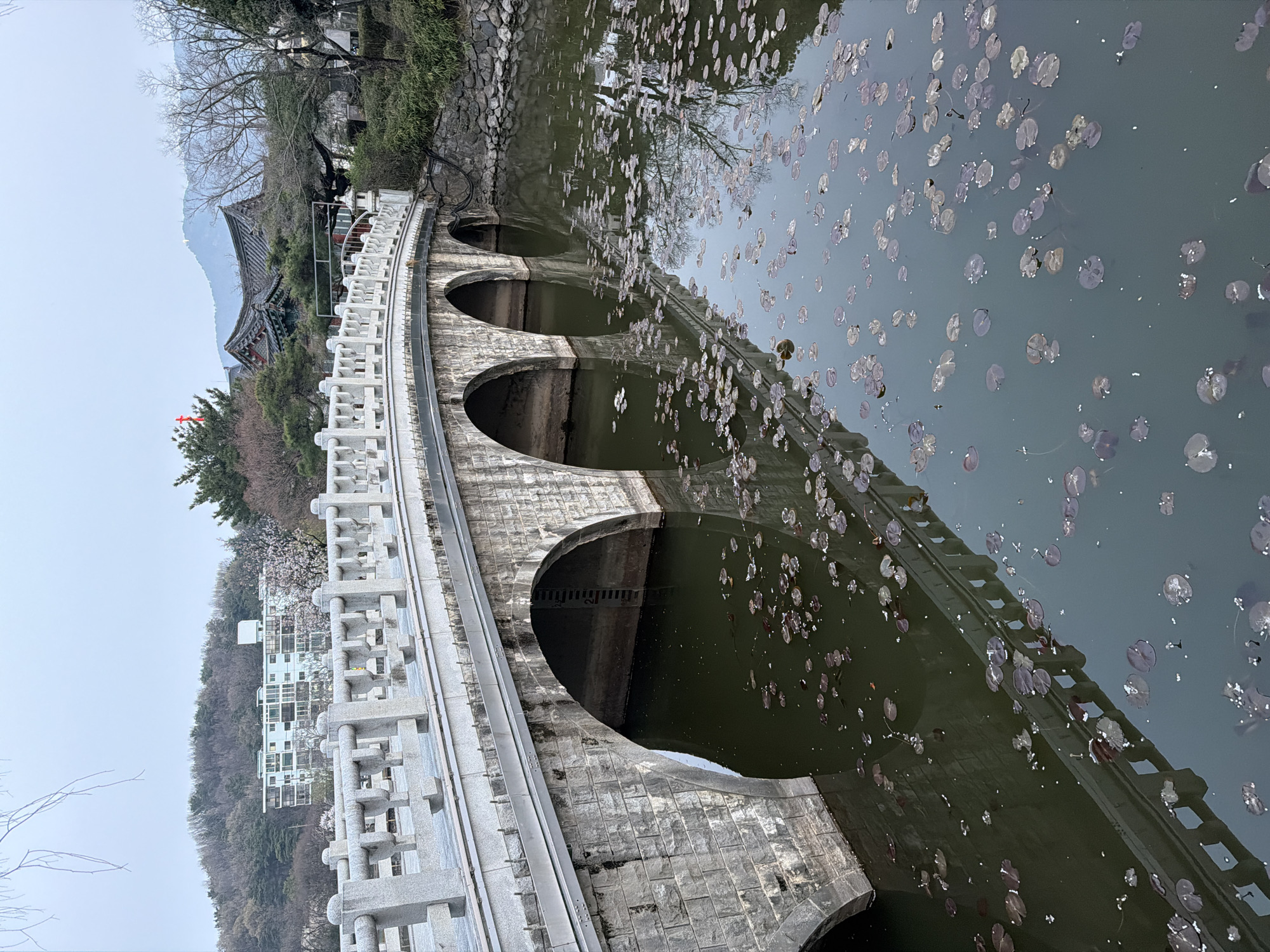 The image displays a multi-arched, light grey stone bridge spanning a still, dark green body of water, likely a pond, within Dalseong Park in Daegu, South Korea. The bridge features an ornate stone balustrade with a repeating pattern of square cutouts and vertical posts. Four visible arches, constructed from rough-hewn stone blocks, support the bridge structure. The water's surface is extensively covered with scattered, dark circular lily pads or similar aquatic foliage, and exhibits reflections of the bridge and surrounding trees. A water level gauge, marked with numerical increments (e.g., '1', '2'), is visible on the pier of the rightmost arch. In the background, on the right side of the frame, a traditional Korean-style building with a dark, multi-layered tiled roof and red and green accents is partially visible amidst a dense cluster of evergreen and bare deciduous trees. A small, traditional stone lantern stands on the bridge's balustrade near the right bank. Distant mountains are visible through a light atmospheric haze under an overcast sky. On the left side of the frame, a modern, multi-story white building with numerous windows is discernible through sparse tree branches on a tree-covered hillside. The overall environment appears calm and devoid of human activity.