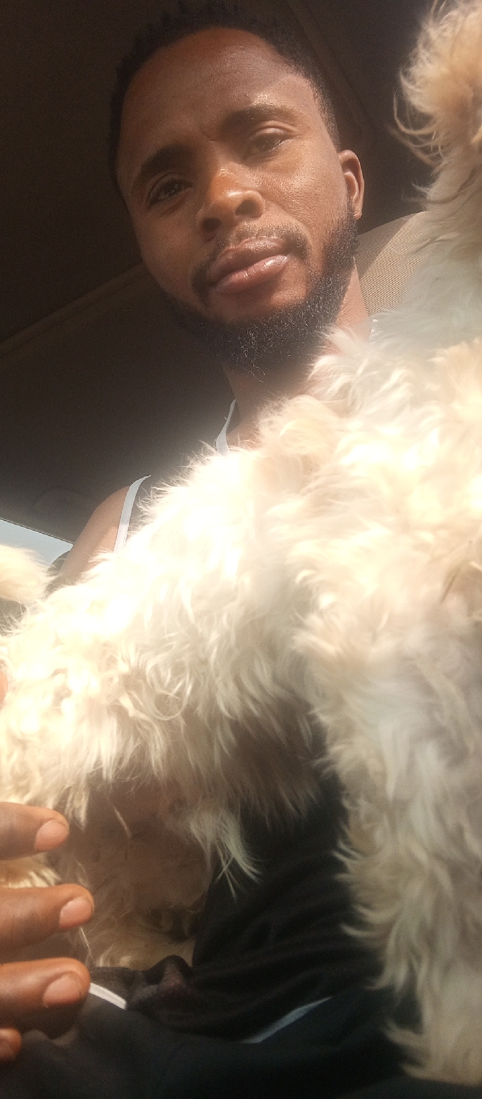 A male individual with dark skin, short dark hair, and a trimmed beard is depicted in a selfie-style photograph taken inside a vehicle. He wears a light-colored sleeveless garment. A small to medium-sized dog with long, off-white, shaggy fur rests against his lower chest/lap area, with his left hand partially visible holding the dog. The vehicle's dark headliner and light-colored seat material are visible in the background. The scene occurs in the city of Sabojibi, Nigeria.