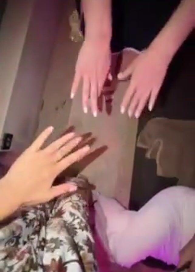 woman in a black bikini top at a beach party. The camera points down to show two sets of hands with fresh manicures. It then pans up to show the woman in a bikini top smiling at the camera. The background shows a beach bar with a thatched roof and purple lighting. There are other people in the background as well. The music is loud and upbeat.