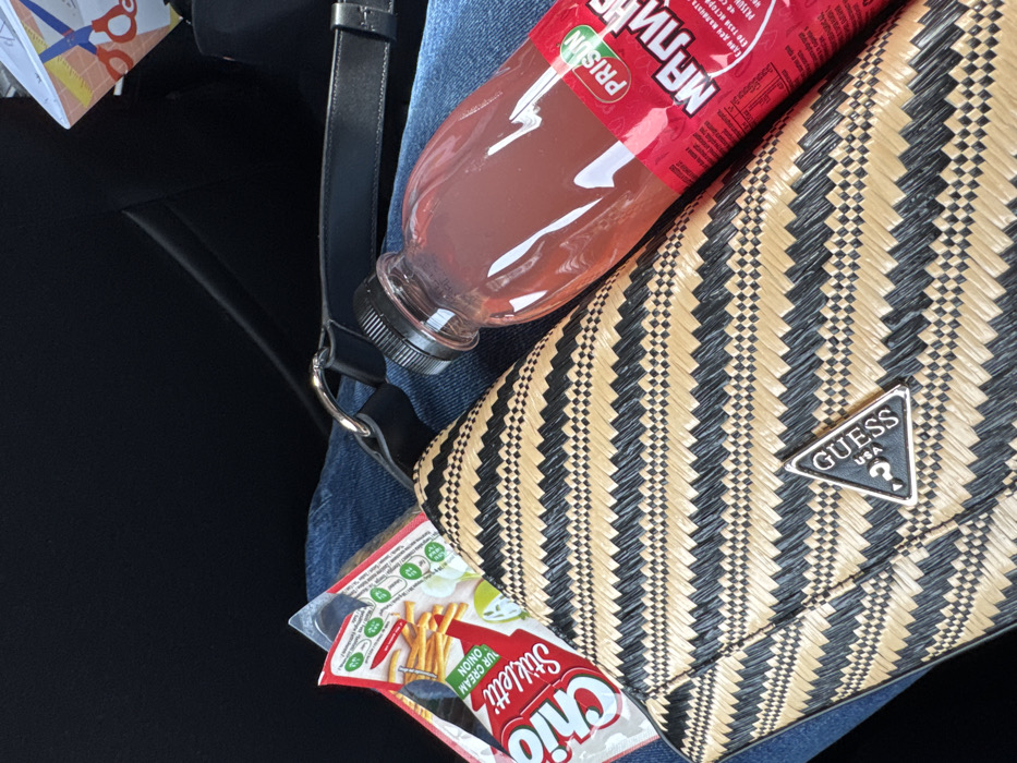 The image depicts a close-up, top-down view of items resting on a person's lap, clad in blue denim jeans, within what appears to be a vehicle interior. This scene is located in Pirdop, Bulgaria. The central object is a black and beige woven bag, possibly a clutch or small handbag, featuring a geometric zigzag pattern. Affixed to the front flap of the bag is a metallic triangular emblem with the text "GUESS USA" and a question mark logo. To the right of the bag rests a clear plastic bottle with a black screw-top lid, containing a reddish-pink liquid. The bottle has a red label that includes "PRISUN" and the Cyrillic text "МАЛИНА" (Raspberry). To the left of the bag, a partially visible white and red snack packet is present. The packet displays "CHIO Stiletti SOUR CREAM ONION" and images of thin, stick-like snacks with an onion graphic. Nutritional information in green boxes is visible at the top of the packet. The background consists of dark, uniform surfaces consistent with a car's interior, and in the upper right, a fragment of a colorful paper or card with a design featuring red scissors is visible. No direct human action or interaction with the objects is observed, as they are stationary on the lap.