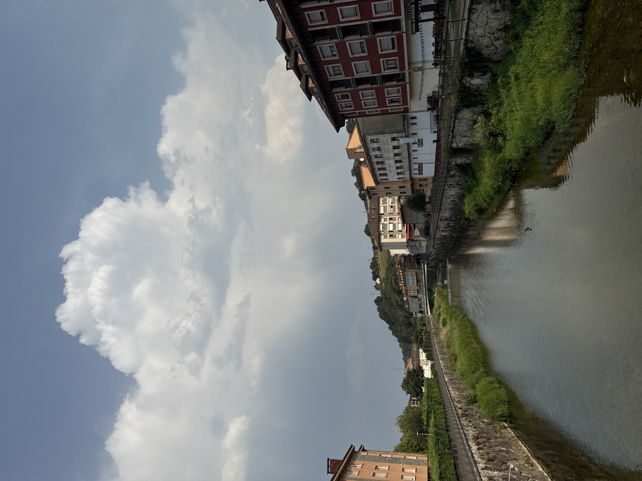 The image presents a panoramic view of the Sella River flowing through Cangas de Onís, Spain, under a partially cloudy sky. The river occupies the lower central portion of the frame, its surface reflecting the sky and adjacent structures. Both riverbanks are lined with stone retaining walls, supporting a narrow strip of land with dense green vegetation, including tall grasses and reeds, some of which also grow in the shallow riverbed. A single small, dark avian form is visible on the water's surface in the mid-ground. On the left side, a multi-story building with light orange/peach colored walls and a darker roof is visible in the foreground. Beyond it, the river curves slightly to the left, and additional buildings of varying sizes and colors recede into the distance, backed by a lush green hillside. On the right side, a prominent, multi-story building, primarily red with dark roofs and numerous windows (some with closed white shutters), dominates the immediate bank. Below this building, a commercial establishment with a striped awning and outdoor seating is identifiable. Further along the right bank, a series of other multi-story buildings, ranging in color from white and grey to ochre, line the river. A light-colored bridge, spanning the river, is visible in the mid-distance connecting the two banks. The background features a verdant, rolling hillside dotted with scattered structures, including a small, distinct white building, possibly a chapel, situated near the crest of a distant peak. The sky exhibits a mix of meteorological conditions: bright blue sky with large, white cumulus clouds in the upper right, transitioning to darker, more overcast grey-blue cloud formations toward the upper left, indicating varying cloud density and potential weather changes. No human figures are visible in the scene.