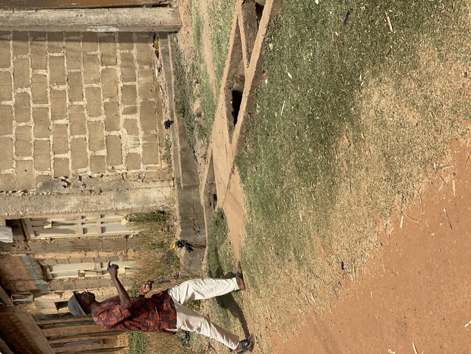 In Muchiya, Nigeria, an outdoor scene depicts an adult male walking across a partially paved and grassy area in front of a weathered building under bright daylight. The man, with dark skin and a visible beard or goatee, wears a dark bucket hat, a short-sleeved shirt with a red, brown, and orange pattern, light-colored trousers, and dark sandals. He is captured mid-stride, moving from left to right, with his right arm extended forward and his index finger pointing directly ahead. In his left hand, he holds a small, light-colored rectangular object, possibly a mobile phone or similar device. The background features a dilapidated building constructed of light-colored concrete blocks, with sections of exposed concrete and multiple weathered, light-colored wooden doors. Dry weeds and sparse vegetation grow along the base of the building. In the midground, running parallel to the building, are several open, rectangular concrete drainage channels or culverts. The ground in the foreground is reddish-brown compacted dirt or soil, transitioning into patches of dry, sparse green grass towards the midground. Small pieces of debris are scattered across the ground and within the drainage channels.