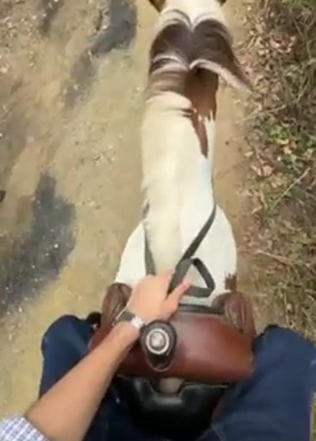 From a first-person perspective, a person is riding a horse along a dirt path