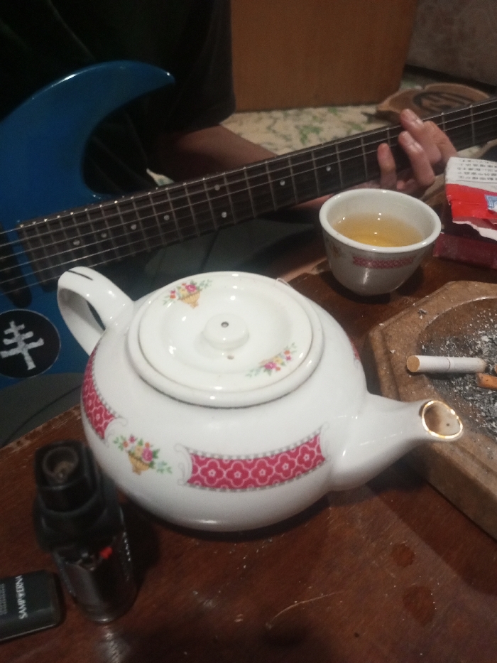 A blue electric guitar rests across a person's lap. On a wooden surface, a white teapot with floral patterns and a red design band sits beside a small cup of tea and an ashtray with cigarette butts. A lighter and a cigarette pack are also visible. The scene suggests a relaxed, perhaps creative, moment with a musical instrument and a tea break.