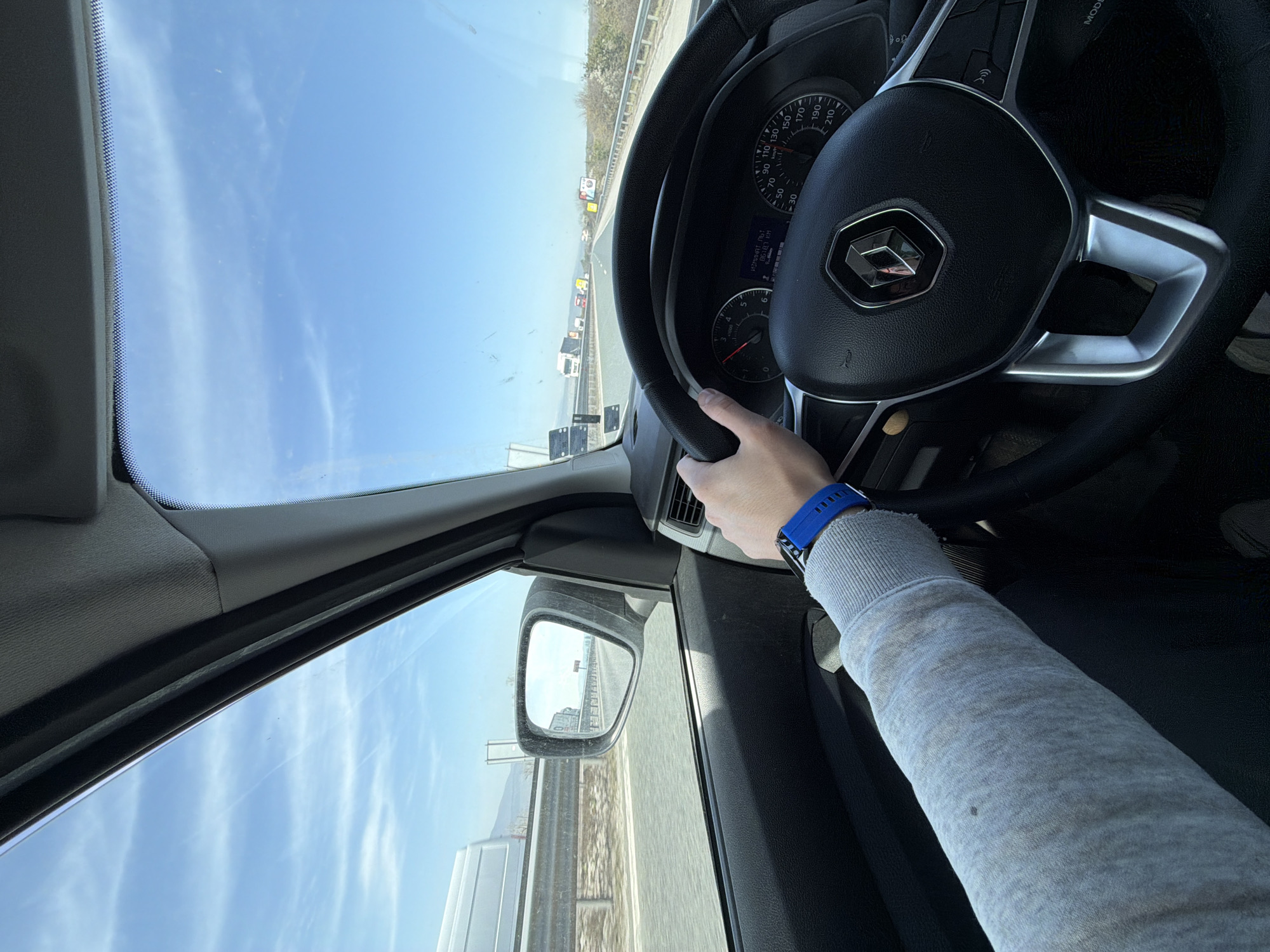 A driver with a gray sweatshirt and blue smartwatch is holding the steering wheel of a Renault car