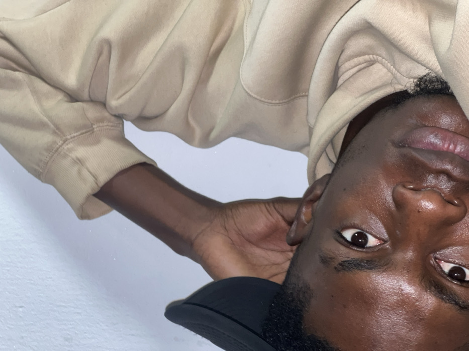 An angled close-up features a brown-skinned individual with dark hair and eyes, wearing a tan hoodie and a black cap