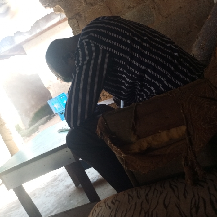 The image depicts a single individual seated indoors within a rustic structure in the city of Unknown, Unknown. The individual, appearing male, is viewed in profile, wearing a dark shirt with thin white horizontal stripes and dark trousers. They are leaning forward with their head bowed. In the foreground, a heavily worn, brown patterned armchair or sofa with exposed stuffing and tears partially frames the scene. A light-colored wooden table with a light green or blue top is positioned in front of the individual. The background reveals rough, unpainted stone or brick walls. Through an opening in the wall, a brightly illuminated outdoor area is visible, featuring a ground surface and two stacked blue plastic crates. No discernible interactions are occurring.