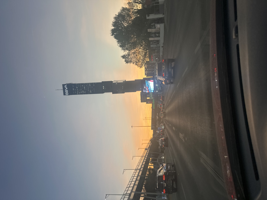 A tall, modern skyscraper with the BBVA logo dominates the skyline against a gradient sunset. The view is captured from inside a vehicle on a busy highway. Cars are visible on multiple lanes of the highway, stretching into the distance. Streetlights line the roadside, and a pedestrian bridge is visible on the left. The image conveys a sense of urban life and movement during twilight.