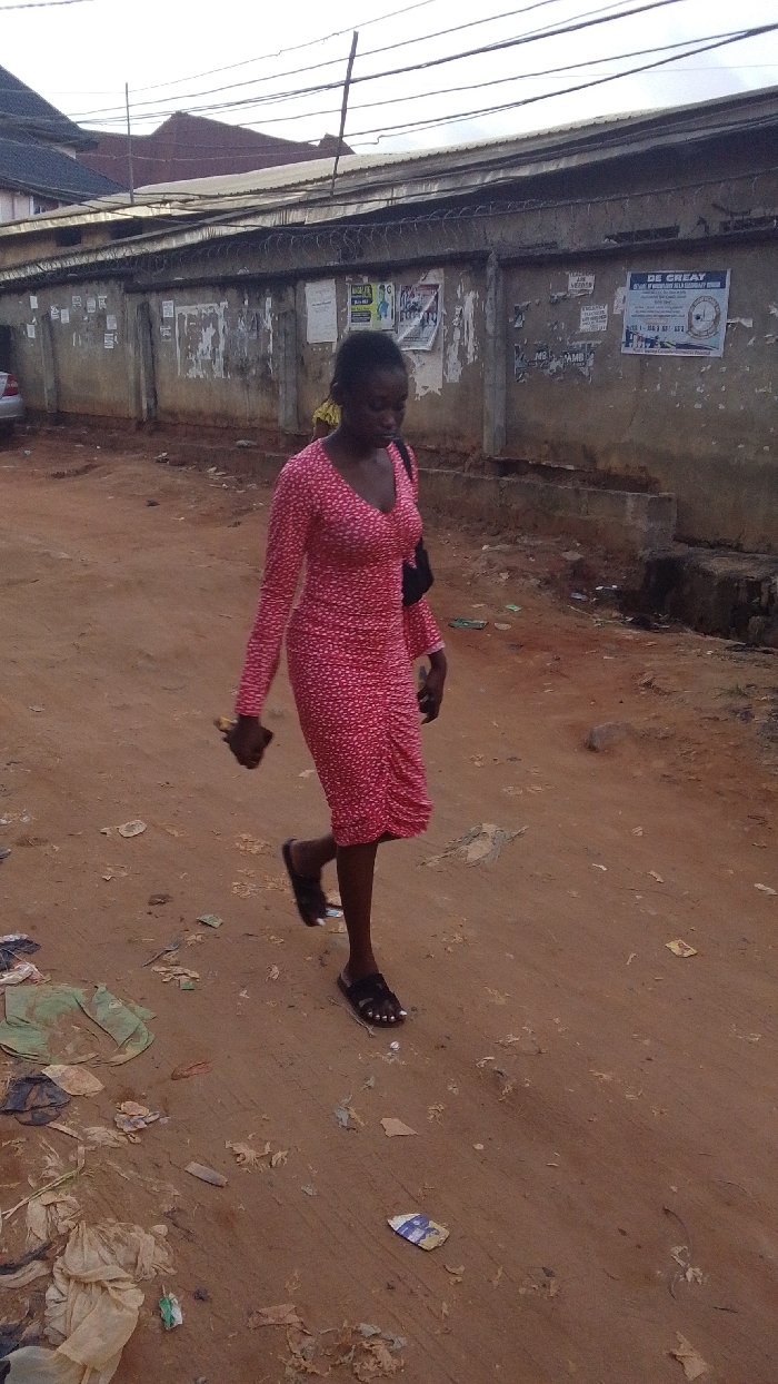 The image displays an outdoor scene on an unpaved, reddish-brown dirt road in Onitsha, Nigeria. An adult female, with a dark complexion, is the primary subject, walking from the mid-right towards the left. She wears a long-sleeved, V-neck, form-fitting, knee-length dress featuring a red base with small white or light-colored patterns. A small black bag is carried over her left shoulder. In her right hand, she holds a dark, indistinct object. She is wearing black open-toed sandals, revealing white nail polish on her toenails. The ground surface is uneven and extensively littered with various discarded materials, including plastic bags, wrappers, and torn paper. Along the left side of the road, a weathered concrete wall, topped with barbed wire, is visible. Multiple torn and faded posters, some with legible text like "DE CREAT," are affixed to the wall. Behind the wall, the roofs of several buildings are discernible, including one with a corrugated metal roof and another with dark tiles. Overhead, numerous utility cables or power lines stretch across an overcast sky. A silver vehicle is partially visible, parked on the far left side of the frame.