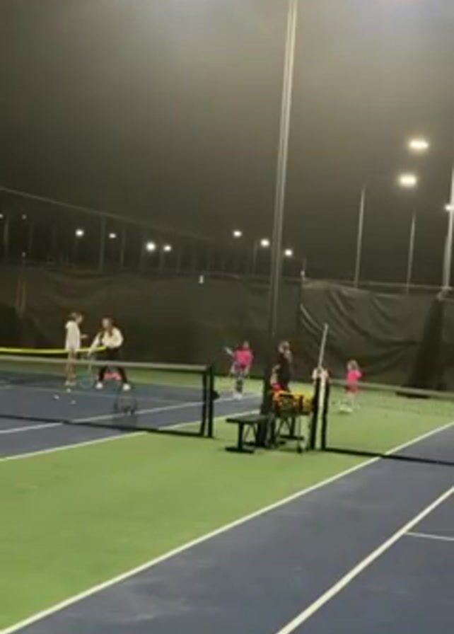 tennis court at night, illuminated by bright overhead lights. There are two tennis courts visible, each with blue and green surfaces separated by a net. On the left court, two individuals, one wearing white and the other wearing black, are practicing tennis. A woman wearing a black top is coaching a group of children on the right tennis court. Two young children are near her; both are wearing pink outfits. The setting appears to be an indoor tennis facility, with dark screening material forming the backdrop. A ball hopper and a small bench are placed near the coach. Several tennis balls are scattered on the courts.
