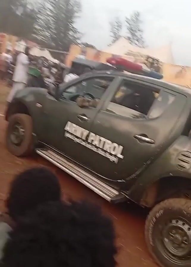 A video shows an olive-green "ARMY PATROL" pickup truck surrounded by a crowd of people
