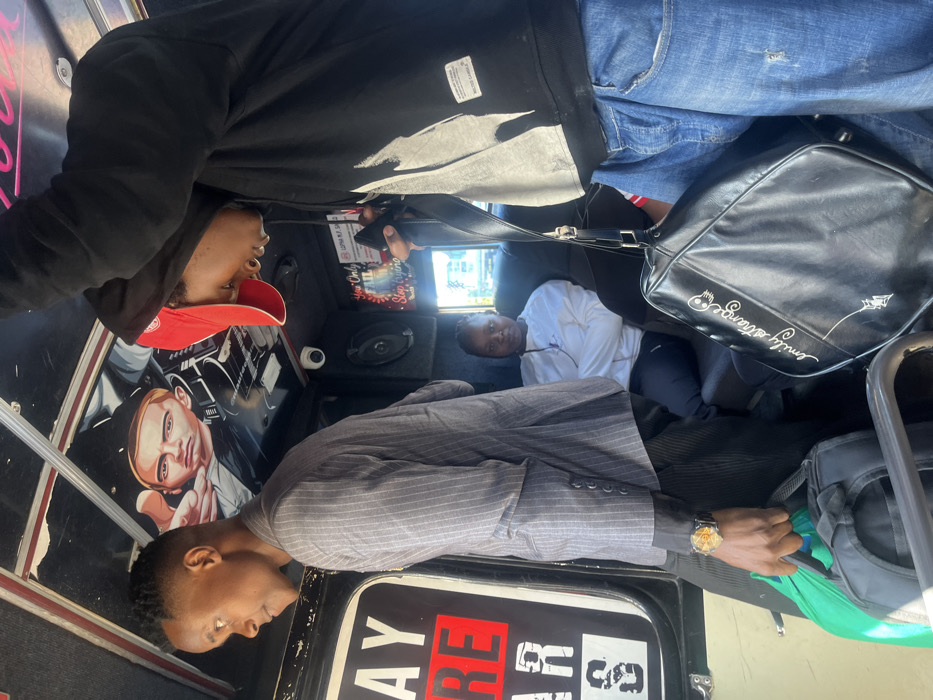 The scene depicts the interior of a customized public transport matatu in Biashara ward, Kenya, illuminated by bright daylight