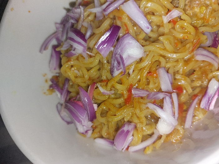 The image depicts a close-up, top-down view of cooked food contained within a white bowl, located in the city of Unknown, Unknown. The primary subject is a serving of yellowish-orange instant noodles, distinguished by their coiled, irregular strands. These noodles are interspersed with numerous thin, crescent-shaped slices of red onion, exhibiting purple and white coloration. Small reddish-orange specks are visible amongst the noodles, suggesting spices or other ingredients. The upper edge of the white bowl is visible, partially framing the dish. The background is dark and blurred, providing no discernible details about the immediate environment beyond indicating an indoor setting. No people, specific actions, or interactions are present in the frame.