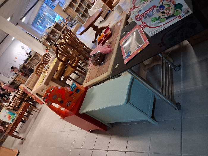 A tilted, slightly high-angle shot captures an indoor scene with a variety of objects. Several wooden tables and chairs occupy the space. A colorful children's play structure is visible. A black table with chrome legs hosts a toy box and a framed photo. The background reveals shelves stocked with items in a retail-like setting, under bright, natural light. The overall impression is a busy, somewhat cluttered interior.