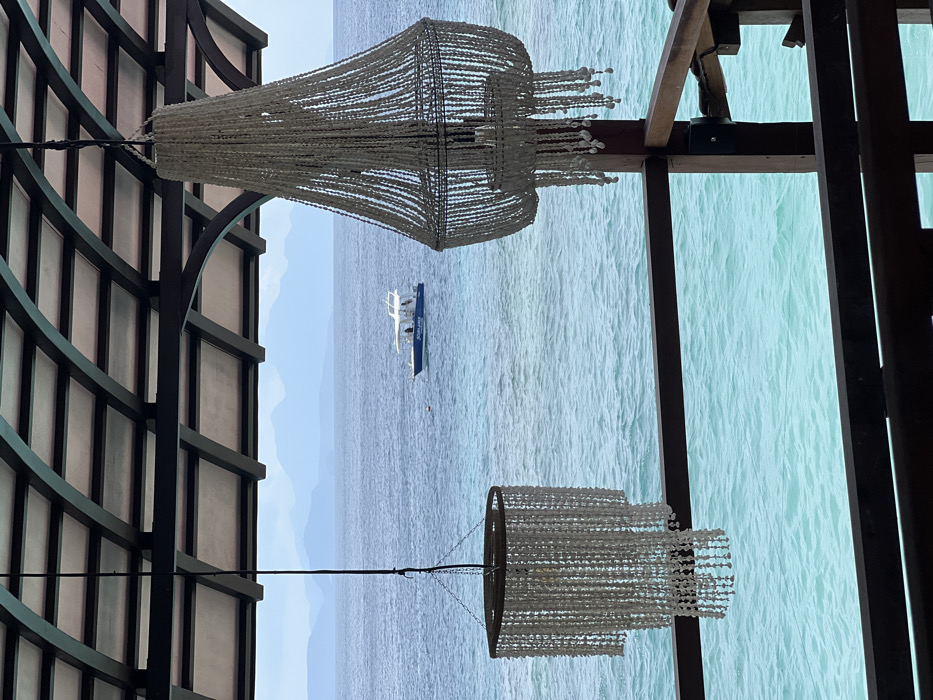 The image depicts a panoramic view of the ocean near Batununggul, Indonesia, observed from under a covered outdoor structure. The foreground features two decorative chandeliers crafted from white shell or bead strands, suspended from a dark-beamed roof. The chandelier on the right is larger and bell-shaped, while the one on the left is smaller and cylindrical with tiered elements. Below these, a dark wooden railing runs across the bottom of the frame. The midground showcases a body of water, transitioning from a turquoise hue closer to the viewer to a deeper blue further out. A white and blue boat, likely a small motor yacht or dive boat, is positioned in the mid-distance, heading towards the right. At least two indistinct human figures are visible on the boat's deck. A small dark buoy or float is present in the water near the boat. The background reveals a hazy, mountainous coastline or distant islands under a light blue sky, indicating clear weather. No specific actions or interactions beyond the boat's movement are clearly discernible.