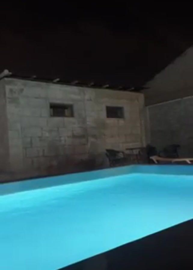 The scene is outdoors at night, featuring a brightly illuminated swimming pool. The pool has a vivid blue glow and appears to be still, with slight ripples. Adjacent to the pool is a weathered, cinder block building with two small, rectangular windows. A few chairs and a small table are positioned beside the building. A figure is seen reclining on a lounger by the pool. The sky above is dark.