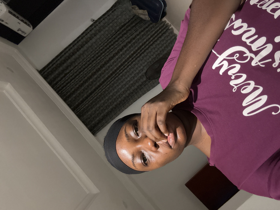 A woman is positioned in the bottom half of the frame, wearing a purple t-shirt with white cursive writing that says "Merry Christmas". She has dark skin and a black headband. Her hand is raised to her mouth, covering part of her face. In the background, a gray rug lies diagonally across the upper half. A white wall is visible in the lower left and a brown rectangular object appears in the lower right. The image is slightly tilted.