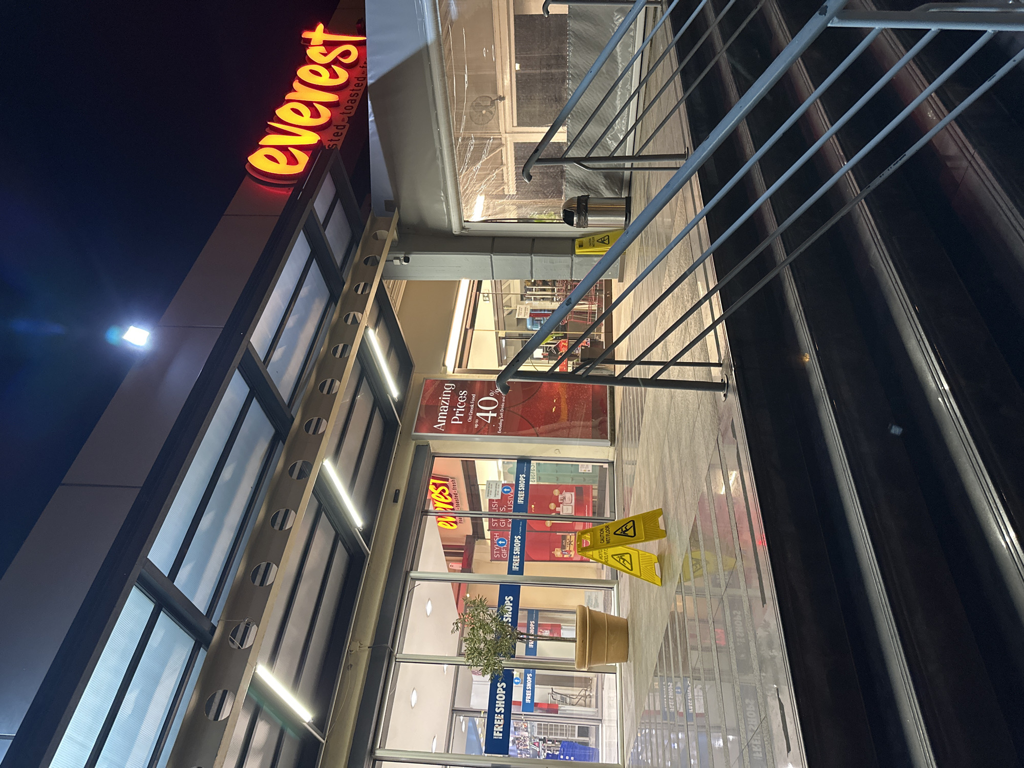 exterior of an "Everest" store, likely a fast-food restaurant, in the Δημοτική Ενότητα Προμαχώνος, Greece. The store has a modern design with large glass windows and a brightly lit "Everest" sign. A sign indicating "Amazing Prices up to 40%" on Greek food is visible near the entrance. There are "FREE SHOPS" logos visible. There are two wet floor caution signs outside the entrance, and a plant in a large pot. A metal handrail is on the right of the frame.