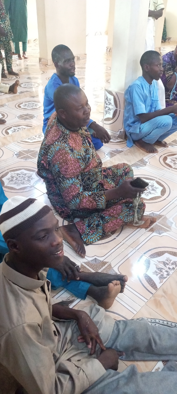 The image depicts an indoor gathering of several males seated on a tiled floor in Aramoko-Ekiti, Nigeria