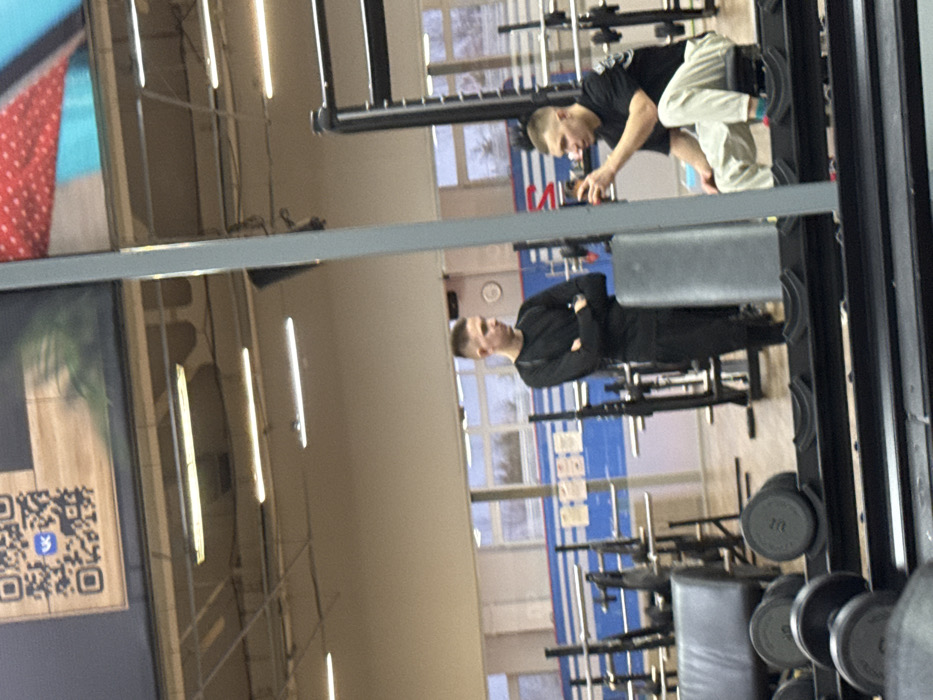 This image captures an interior scene within a gym facility in Chaikovsky, Russia. The viewpoint is directed towards a reflective surface in the foreground, likely a mirror, which displays the main elements of the scene. Two young adult males are present. On the left side of the reflection, one male stands with his arms crossed over his chest. He wears a black long-sleeved athletic shirt and black athletic pants, and has a short, close-cropped haircut. He appears to be observing or listening, with his gaze directed generally towards the right. To his right, partially obscured by a prominent grey vertical column, a second male is seated on a low bench. This individual wears a black short-sleeved t-shirt, light-colored (possibly beige or khaki) pants, and patterned socks. He also has a short, close-cropped haircut. He is holding a smartphone in his right hand, seemingly viewing its screen or recording. His left hand is slightly raised. The background features large windows extending across the upper portion of the wall, revealing an overcast sky and deciduous trees outside. Below the windows, the wall is white with distinct horizontal blue stripes. Various pieces of gym equipment, including black metal weight racks, barbells, and a padded workout bench, are visible throughout the space. A rack of dumbbells with black rubberized ends is reflected in the bottom-left foreground of the mirror. Overhead, the ceiling is equipped with multiple long fluorescent light fixtures providing illumination. In the upper left background, a large QR code poster is visible, clearly displaying the VK (Vkontakte) social media logo, which confirms the Russian linguistic and cultural context. The floor appears to be a light-colored, possibly concrete or tiled, surface.