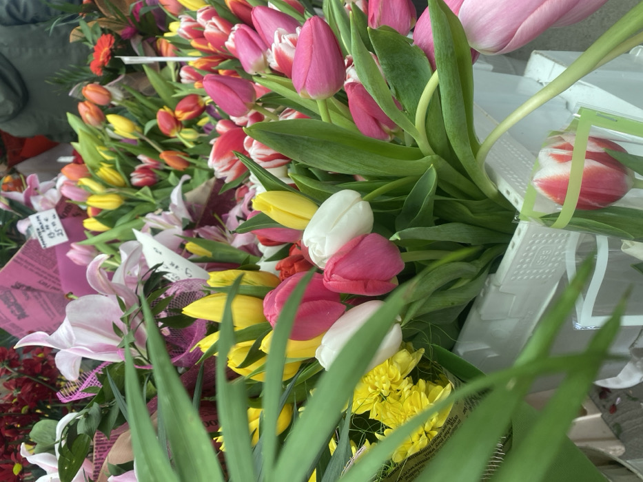 - "The image displays a vibrant, densely packed floral arrangement, primarily consisting of cut tulips and lilies, within a commercial setting such as a flower shop or market stall in Varna, Bulgaria" by FM-Eamgg1, licensed under CC BY 4.0