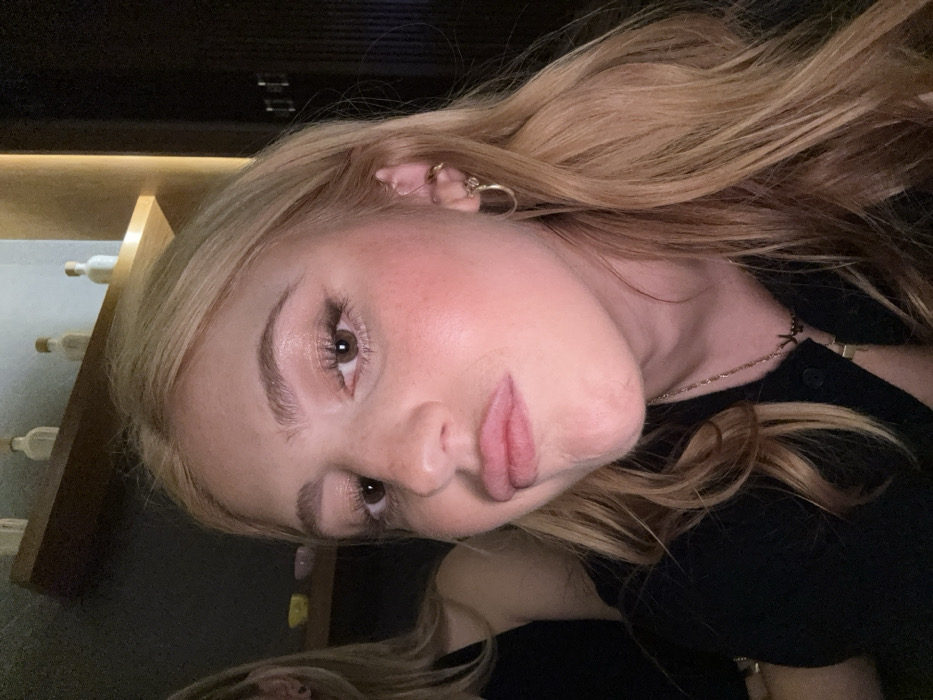 - "A close-up, dimly lit indoor photograph captures a fair-skinned female with long, wavy blonde hair, looking directly at the camera with a slight pout" by FM-INN6o1, licensed under CC BY 4.0