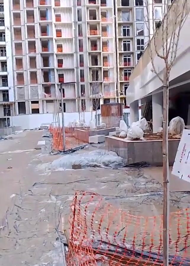n active construction site with a large, unfinished apartment building in the background. The ground is wet and appears to be concrete or stone. There's orange safety fencing, and construction materials like insulation and ALSTRONG A2 panels are visible. A person appears briefly under an overpass, seemingly working. A young tree stands in the foreground. The overall impression is of an active construction zone in an urban setting.
