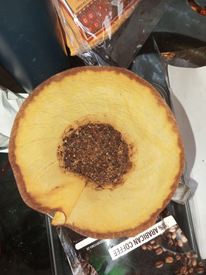 A used, round coffee filter sits with spent coffee grounds settled in the center. The filter paper is a light yellowish color with a darker brown ring around the edge and darker brown around the bottom. A package of "100% Arabica Coffee" lies partially beneath the filter, while other miscellaneous items and packaging, including a dark blue item, are strewn around the filter on a dark surface.