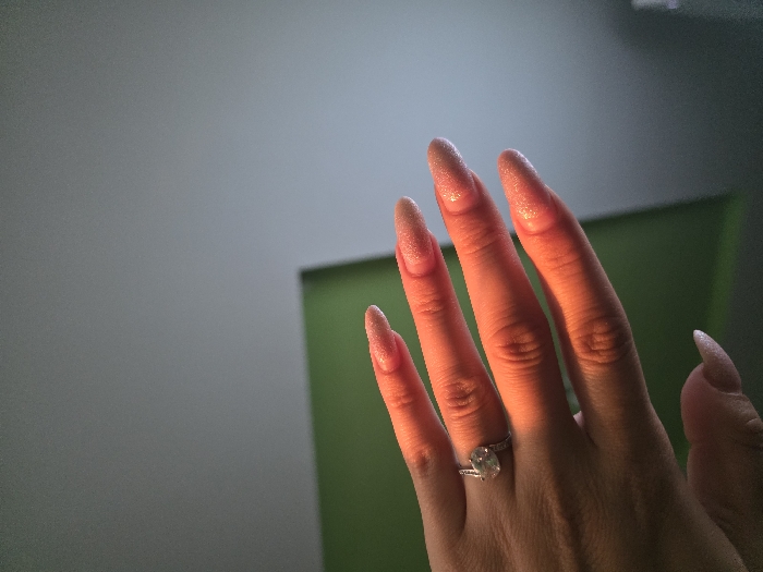 An image taken in Staliyska mahala, Bulgaria, depicts the dorsal aspect of a left human hand. The hand exhibits extended, almond-shaped artificial nails with a light, shimmery, possibly pink or nude glitter finish. A silver-toned ring with a prominent oval or cushion-cut central stone, flanked by smaller stones, is worn on the fourth digit. Strong, warm-toned light illuminates the hand from the left, creating an orange hue on the skin and distinct shadows between the fingers. The background is out of focus, featuring a large, flat, dark green surface to the lower-left and center, and a solid light grey surface above and to the right. No other individuals or actions are visible.