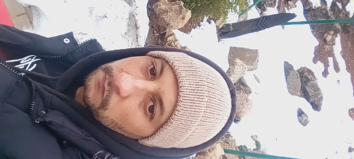 A male individual is depicted in a close-up, head-and-shoulders portrait, consistent with a selfie, against a snowy outdoor background in Ifrane, Morocco