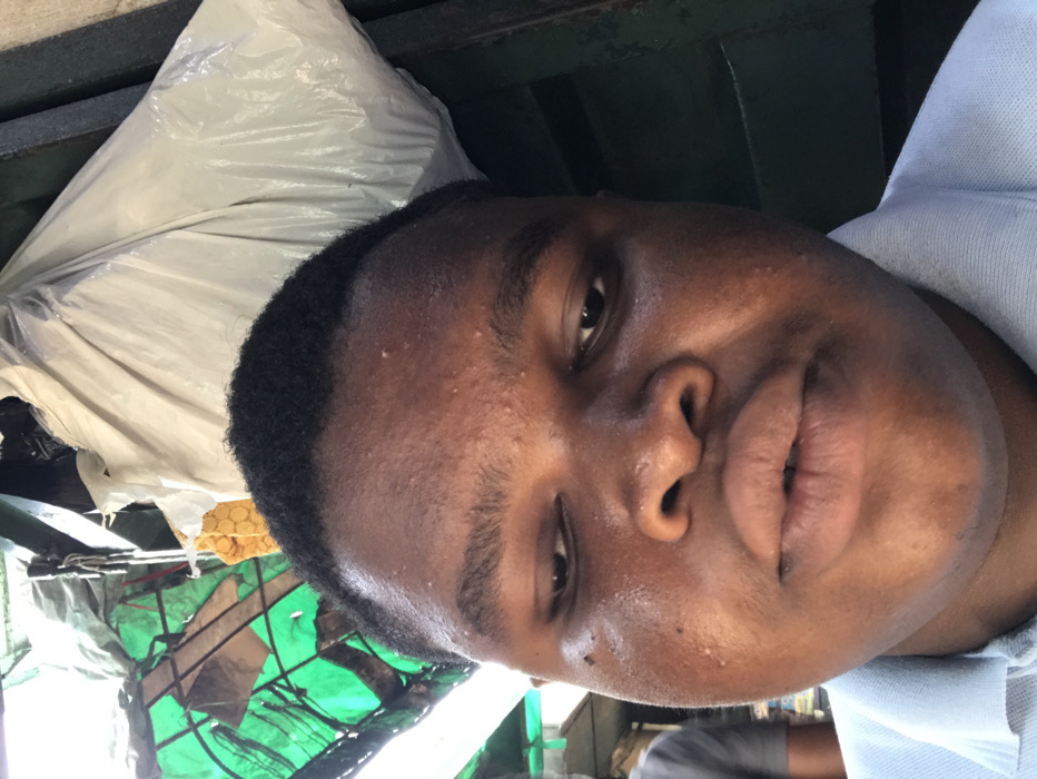 A close-up portrait captures a young Black male in an outdoor setting in Lekki, Nigeria. The subject, appearing to be in his late teens or early twenties, fills the majority of the frame, facing forward with eyes cast slightly downward and lips slightly parted. He has short, dark hair and a dark complexion with visible skin texture and small bumps on his forehead and cheeks. He is wearing a light blue collared polo shirt. The environment directly above his head features a green, tattered tarpaulin on the upper left and a large, off-white plastic bag on the upper right, indicative of a market stall or roadside setup. A small, yellow, textured item is visible centrally in the upper background. To the subject's left, a portion of another person's shoulder and arm, clad in a grey shirt, is visible. The lighting produces a visible sheen on the subject's skin.