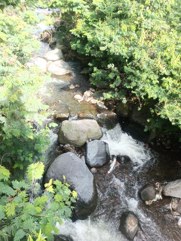 A stream flows swiftly over dark boulders and rocks, creating small waterfalls and rapids. Lush green foliage overhangs both sides of the waterway, partially obscuring the view. Some trash is visible among the rocks within the stream, suggesting pollution. The water is turbulent and aerated in sections, and sunlight filters through the leaves, creating varying light levels.