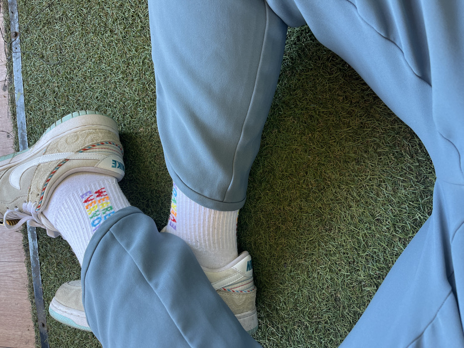 A top-down view depicts the lower legs and shod feet of an individual resting on artificial green turf. The person is wearing light blue-green trousers and white crew socks with rainbow-colored text. The left sock displays "WE'RE", while the right sock shows a partial "EVERYO" and the 'NIKE' logo. The footwear consists of light-colored Nike sneakers with beige uppers, light blue-green outsoles, and multi-colored stitching details on the sides. A dark, flat surface, separated from the turf by a thin, dark metallic strip, is visible in the upper background. The specific location within the city of Arica, Chile, is not discernible from this image.